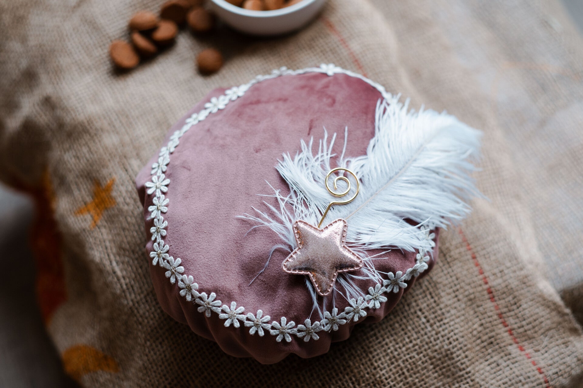 De eyecatcher tijdens het Sinterklaasfeest! Gemaakt van zachte velours stof in een elegante roze tint, afgewerkt met bloemenkant en één normale witte veer voor een chique en speelse uitstraling.