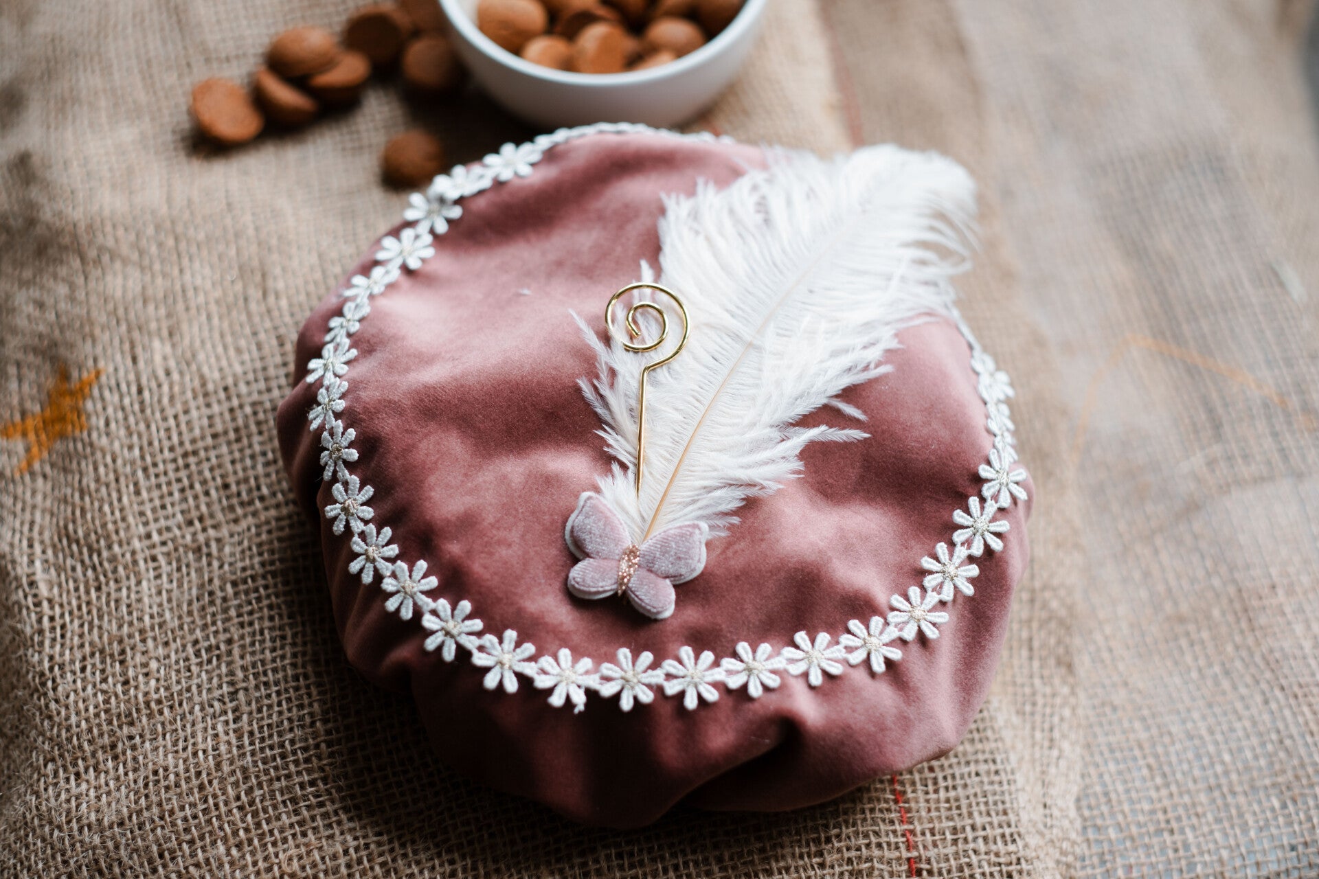 Naar wens kan de muts worden versierd met een extra mooie struisvogel veer en fornituur (zoals een hartje, ster, beer etc) om het geheel helemaal af te maken.