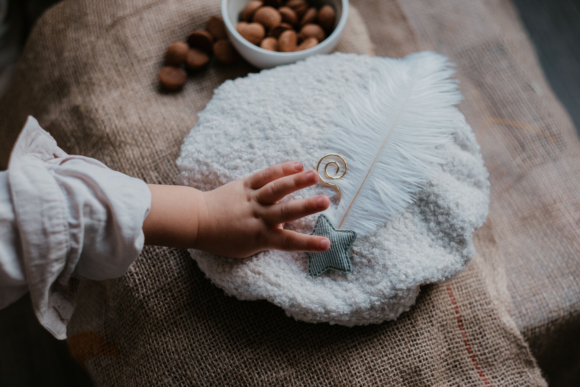 Inbegrepen voor €23,95: één pietenmuts teddystof + geborduurde naam in beige, veer, sinterklaasstaf en één fornituur naar keuze.